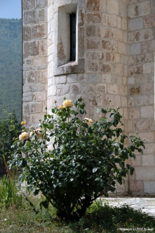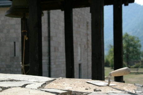 СанекК на спуске был первым, а посему пролетел большой такой указатель налево. До монастыря с главной дороги всего 400 м, хоть и под горочку, и пропускать такое я категорически не хотел. Встал. Жду. Через некоторое время возвращается летчик. Выясняем отношения, прошу повнимательнее читать такие вот знаки и не пропускать их (как минимум не посовещавшись, ибо мы не гоняемся, а путешествуем на велосипедах по Черногории). Сруливаем под горочку с главной дороги и оказываемся у каменной стены реконструируемого (или достраиваемого) монастыря. Два работника копошатся на стене. Добродушно встречают нас и на вопрос о возможности посещения говорят, что "конечно же можно!", рекомендуют поставить велосипеды не так как мы сделали (у входа), а завести вовнутрь. Оставляем велы под присмотром арбайтеров, шлем на руль, фотоаппарат в руки... Пожалуй, ничего не буду дополнительно о монастыре рассказывать, просто посмотрите фото оттуда.
