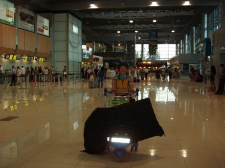 Билет был на 8 утра (если не изменяет память, но компания Ани там была с ночи и Аню вызывала в три часа), но я в 6 уже была там с разобранным велосипедом. Это ничего, что одна педаль у меня не открутилась, и не по всем правилам я его укутала, потому как в аэропорту я узнала, что еще у кого то педали не открутились. Ну и ладно, меньше работы при сборке. Признаюсь честно, я цепь могу перепутать на звездах, вернее на лапке не знаю, как ее кидать. Ну да ладно, у меня есть попутчики туда, а назад буду разбирать - так дома хоть трава не рости. Там я и пешком с аэропорта доведу велик. В общем, с велосипедами у нас все вышло хорошо, взяли молча даже с перевесом в 1-2 кг.