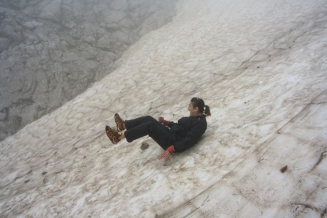 На спуск повел знакомой "сложной" тропой. Главное развлечение Дурмитора - катание по снежникам.