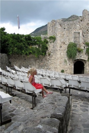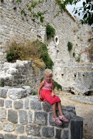 Следующим утром опять пришли на станцию к 7.30, но уехали только в 8.25. К этому времени и касса открылась (кассирша пришла за пять минут до появления автобуса). Видимо, в конце сезона часть автобусов отменяют, а изменения в расписание внести или хоть объявление повесить никто не удосужился. В Баре хоть рукописное новое расписание висело. Стоимость проезда 2.50 евро, дети бесплатно, ехать около получаса. В Баре автобус делает одну остановку в центре, где основные магазины расположены, и на автобусной станции. Спросили кондуктора, где выходить, чтобы ближе к старому городу было. Сказал – на автобусной станции. Это была наша первая ошибка. Нужно было выходить в центре, а оттуда на местном автобусе №22 можно доехать до крепости. Мы же доехали до автобусной станции, а оттуда до старого города только пешком или на такси (там их много дежурит). Но таксисты до старого города просили 4 евро. Доехав из Петроваца за 5 евро, платить по городу 4 евро – опять «жаба задушила», решили прогуляться пешком, посмотреть окрестности. Это была наша вторая ошибка. Дорога ничего интересного из себя не представляет, особенно вначале пути какие-то задворки, стройбазы, автосервис… Сразу от автобусной станции нужно повернуть направо и по улочке идти до железной дороги, перейти на противоположную сторону и идти дальше в том же направлении. Дойти до автомобильной развязки с круговым движением и по пешеходному переходу перейти на противоположную сторону. Там после большого супермаркета (в нем целый класс школьников, видимо на переменке, отоваривался бургерами – продавщица резала большую булку пополам, клала внутрь пару ломтиков колбасы и сыра, мы себе тоже такой же купили на перекус, 1.5 евро) повернуть направо и дальше по тротуару вдоль дороги среди коттеджей вперед и вверх примерно 3 км. Поскольку приехали в Бар достаточно рано, солнце еще не вышло из-за гор, а на небе были тучки, идти было не особо тяжело, но не интересно. На улице ни души – либо все еще спят, либо это спальный район и все уже уехали на работу на машинах. Только «крейзи рашн» ходят тут пешком. Хотя видели парочку молодых с рюкзачками и в высоких ботинках на босу ногу – тоже шли в том же направлении. Примерно через полтора часа пути, с остановками – посидеть на лавочке, перекусить, попить водички, съесть мороженого – мимо современной церкви, мимо кладбища, мимо вот таких особнячков, мимо мечети дошли до места.